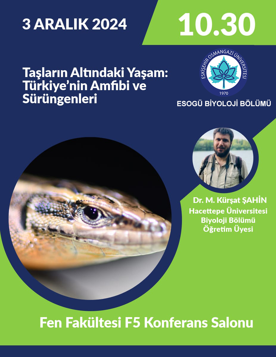 3 Aralık 2024 Salı saat 10:30'da F5 blok Konferans salonunda, Dr. Öğretim Üyesi Mehmet Kürşat Şahin tarafından "Taşların Altındaki Yaşam: Türkiye'nin Amfibi ve Sürüngenleri" başlıklı Konferans düzenlenecektir.