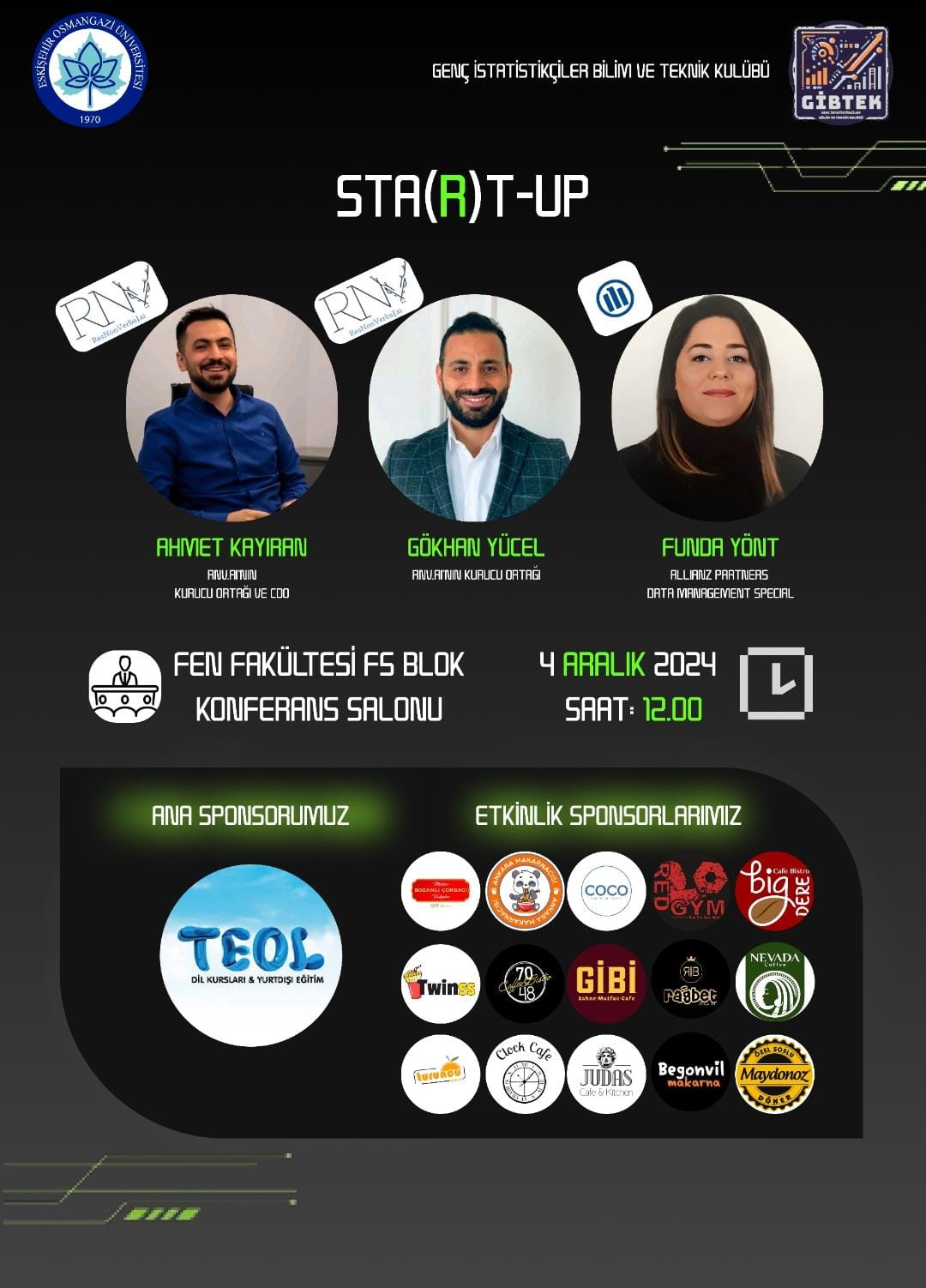 Fakültemiz İstatistik Bölümü bünyesinde faaliyet gösteren Genç İstatistikçiler Bilim ve Teknik Kulübü 04 Aralık 2024 Çarşamba günü 12.00-17.00 saatleri arasında F5 Konferans Salonunda "Star(t)-Up" başlıklı etkinlik düzenleyecektir.